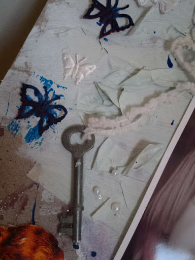 Askartelin eilen jotain, jonka esikoinen nimesi "sottapyttytauluksi." Siihen tuli paksulle pahvipohjalle akryylimaalia, sormivärejä, kimallesuihketta, maalarinteippiä, sanomalehteä, korjausnauhaa, pahvikirjaimia, huopakoriste, neppareita, helmiä, paperimassatähti, kangasperhosia, leimoja, tarroja, nauhaa, lankaa, avain, suklaarasian kantta, valokuva ja mannaryynejä.